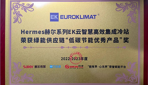 實至名歸!EK云智慧高效集成冷站榮獲“低碳節能優秀產品”獎!2023-02-13在2022-2023年度綠能供應鏈評選活動中,EK空調旗下Hermes赫爾系列EK云智慧高效集成冷站憑借在節能高效、系統集成、智能控制等方面的突出優勢,榮獲“低碳節能優秀產品”獎,并獲得組委會頒發的榮譽證書。