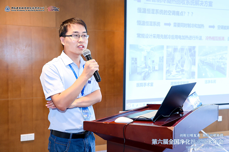 年會現場,EK空調高級工程師張曉偉以《三管制冷凝熱回收系統節能解決方案》為主題發表演講,向現場嘉賓和觀眾介紹了EK兼具潔凈和節能優勢的三管制冷凝熱回收系統節能解決方案,并分享了EK三管制在醫療、制藥、實驗室等潔凈和恒溫恒濕場所的節能應用。