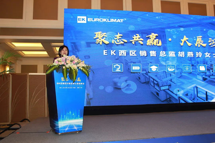 會(huì)議開始,EK空調(diào)華西區(qū)區(qū)總胡燕玲首先致辭,她向在場嘉賓介紹了疫情三年來EK空調(diào)在四川以及整個(gè)華西地區(qū)的業(yè)績增長情況,并感謝各位經(jīng)銷商長期以來的支持。希望在2023年,大家可以把握市場機(jī)遇,一起再創(chuàng)佳績。胡燕玲強(qiáng)調(diào):商家賺到錢,我們才有市場。