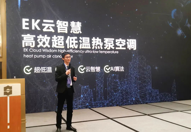 本次會議以“低碳設計,智慧運行”為主題,圍繞建筑環境營造低碳技術、近零能耗建筑、清潔供熱技術與設備、智慧能源等國內外熱點方向開展研討交流。EK空調產品經理陳旭金以《EK云智慧高效超低溫熱泵空調》為主題發表演講,和現場嘉賓介紹了普通風冷熱泵和超低溫空氣源熱泵的區別、EK超低溫熱泵的發展歷史、產品陣容、系統優勢以及在嚴寒地區各行業的應用案例。