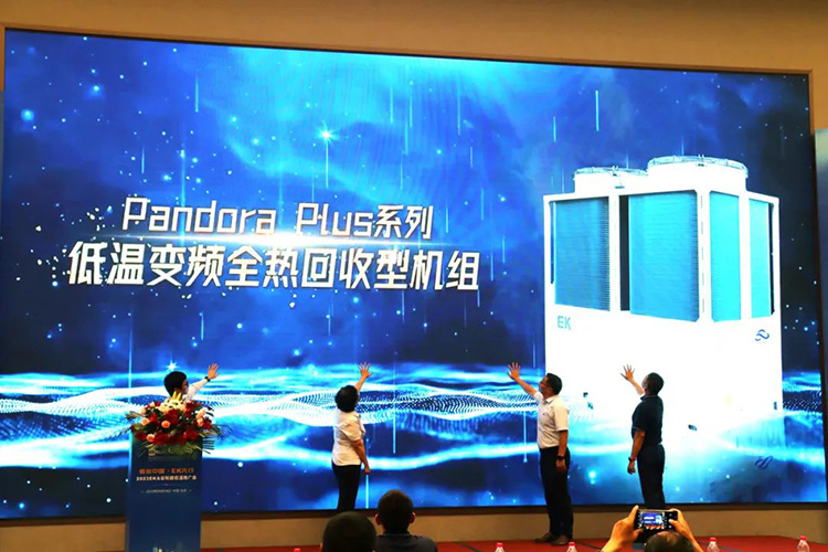 在Pandora Plus 系列低溫變頻全熱回收型機組新品發布儀式上,中國勘察設計協會建筑環境與能源應用分會、國防委員會副主任委員、中國電子系統工程第二建設有限公司暖通顧問郭蓉,EK空調京津區區總陶文忠,質量及商用熱泵采暖事業部總監沐東平,商用熱泵采暖事業部產品經理陳旭金共同按下啟動手印,見證該機組在北京地區的正式發布。