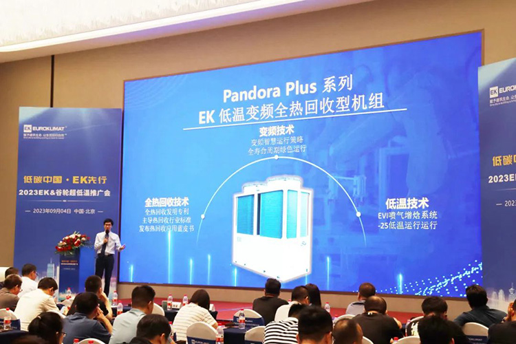 會議現場,EK空調商用熱泵采暖事業部產品經理陳旭金和現場嘉賓介紹了EK全熱回收技術的優勢、特點以及在酒店行業的應用,并隆重推出Pandora Plus 系列低溫變頻全熱回收型機組。該機組集變頻技術、全熱回收技術、低溫技術為一體,采用變頻智慧運行策略和EVI噴氣增焓系統,可在-25℃低溫環境中高效穩定的運行。