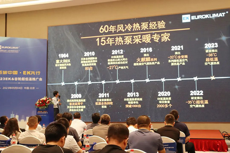 9月4日,低碳中國·EK先行——2023 EK&谷輪超低溫推廣會在北京隆重舉行。EK空調京津區區總陶文忠、商用熱泵采暖事業部總監沐東平、北京辦事處總經理鄒林、北京集團客戶部總經理張杰、商用熱泵采暖事業部產品經理陳旭金、商用熱泵采暖事業部研發經理李鵬等領導,谷輪環境技術有限公司市場部經理季磊以及來自北京地區的120余名EK核心經銷商齊聚一堂,共襄發展。中國勘察設計協會建筑環境與能源應用分會、國防委員會副主任委員、中國電子系統工程第二建設有限公司暖通顧問郭蓉等行業專家應邀出席。