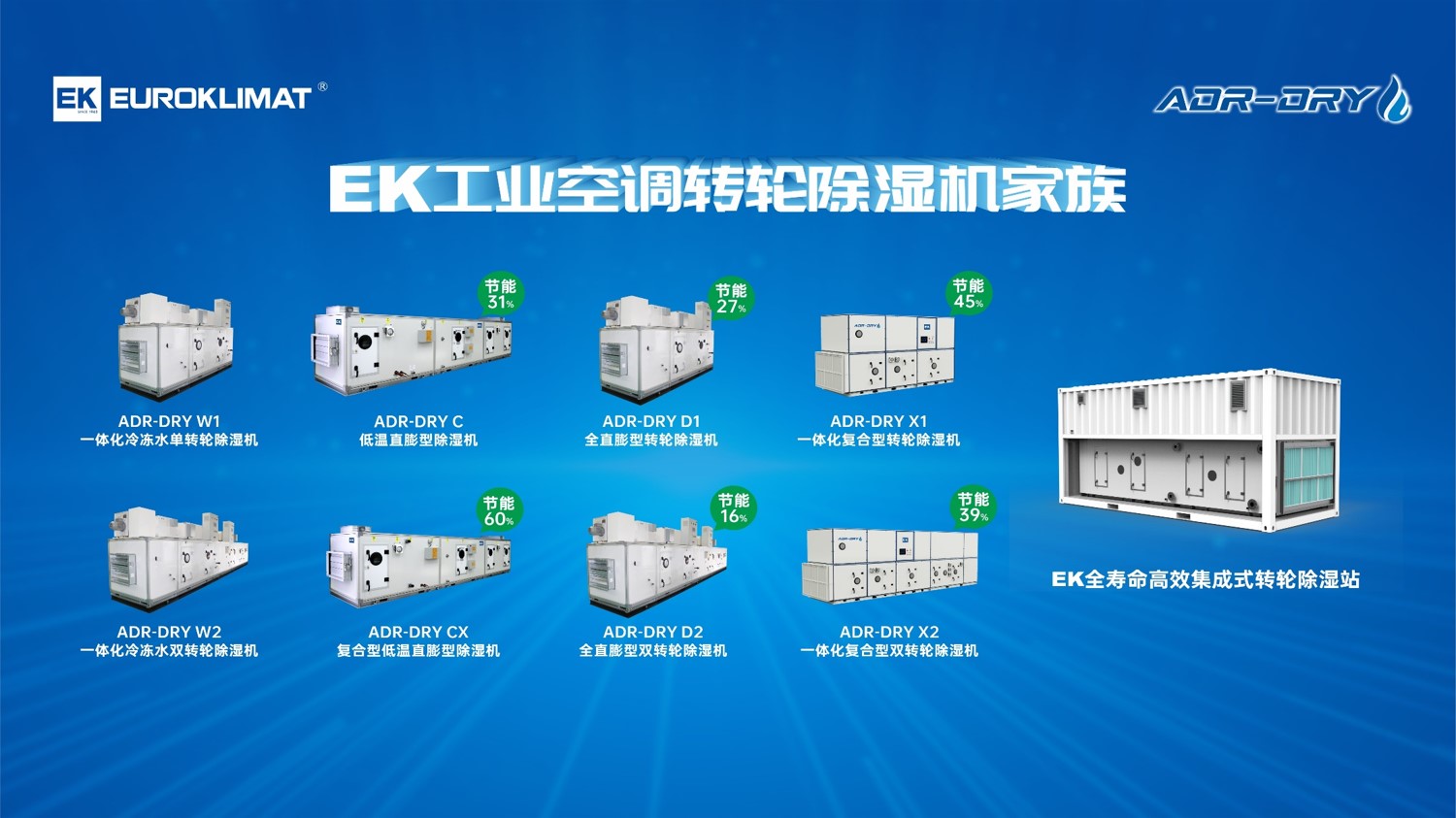 針對鋰電車間除濕系統高能耗痛點,EK近年來不斷提出創新的節能解決方案。其中,斬獲2023年度創新技術獎的ADR-DRY系列一體化高效除濕機,則是EK在新能源電池領域除濕解決方案的拳頭產品。機組在轉輪除濕技術的基礎上集成了EK自主研發的DP5低溫直膨深度除濕技術、廢熱回收型高溫熱泵技術、三管制熱回收技術,將場景應用與高效節能緊密結合,節能率最高可達60%,滿足新能源電池各環節生產工藝環境的極限濕度要求的同時,大大降低運行能耗,讓電池生產更節能。