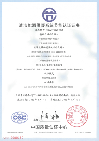 監測數據顯示,項目室內溫度實測值達到23.7℃,系統制熱性能系數實測值達到2.11,達到嚴寒地區的節能系統標準,獲得CQC中國質量認證中心頒發的“清潔能源供暖系統節能認證”。