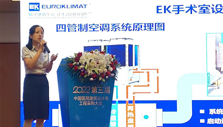 大會現場,EK空調水系統產品經理呂芳玉以《EK熱回收系統與您攜手共建環境友好型醫院》為主題發表演講。呂芳玉以廈門大學附屬翔安醫院為例,和大家詳細介紹了EK節能空調設備在不同醫院場景的應用。