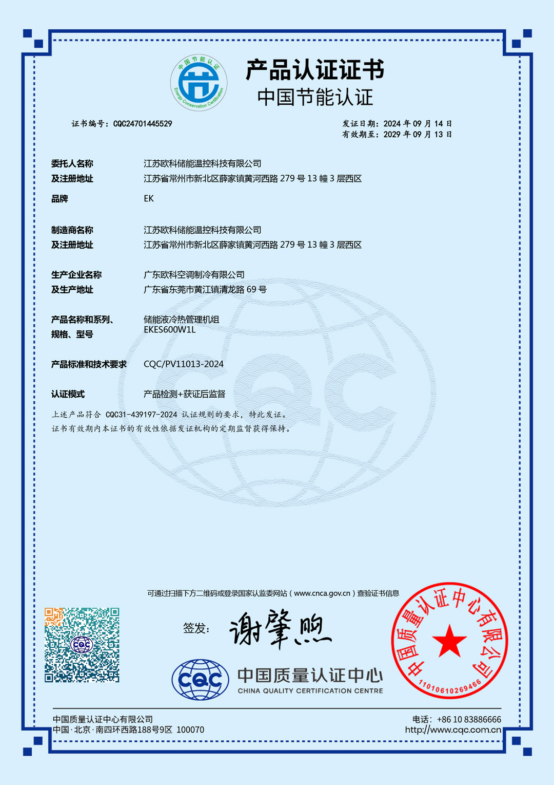 實力彰顯!EK儲能液冷熱管理機組榮獲CQC中國節(jié)能認證