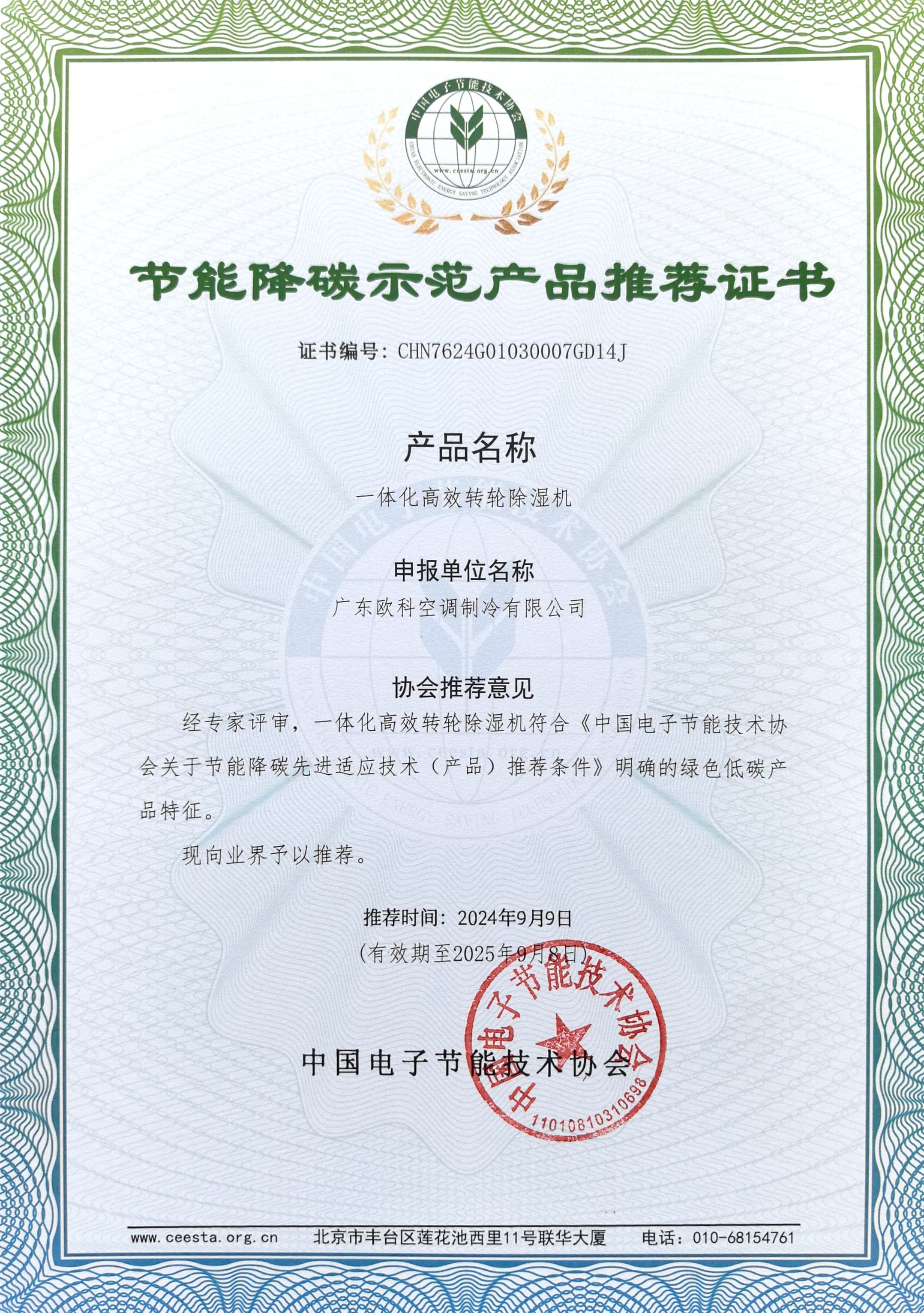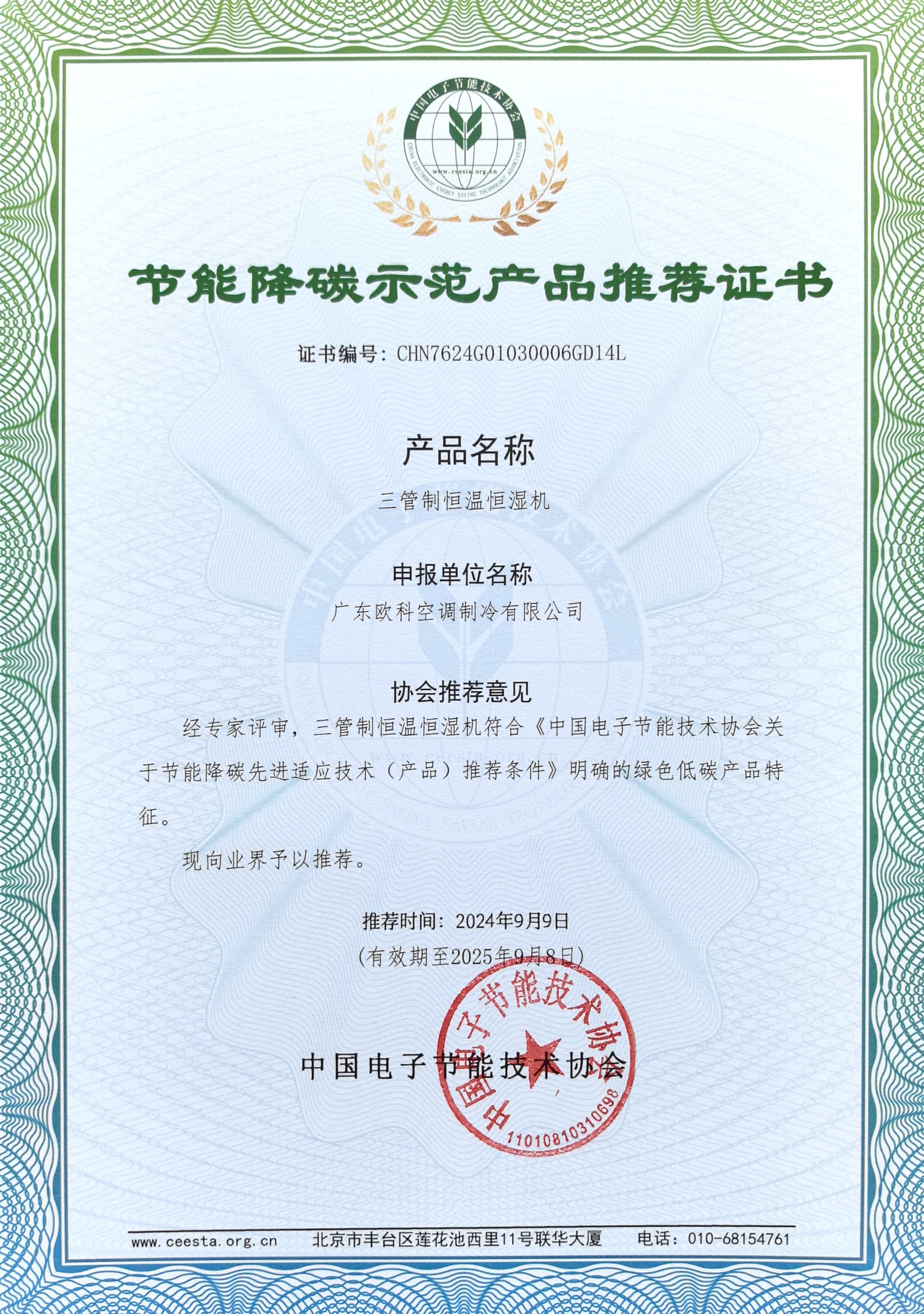 近日,EK工業空調旗下一體化高效轉輪除濕機、三管制恒溫恒濕機、云智慧高效集成冷站等產品,憑借出色的節能降碳優勢,成功通過中國電子節能技術協會的專家評審,被授予“節能降碳示范產品推薦證書”。這是業界對EK工業空調技術創新實力的肯定,也是對EK空調在綠色科技領域持續貢獻的認可。