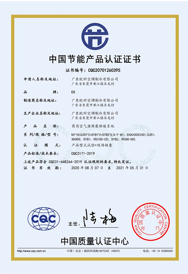 EK低溫空氣源熱泵機組榮獲清潔供暖系統節能產品認證證書